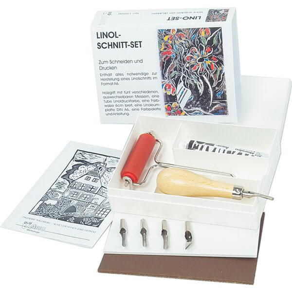 Enthält alles was man benötigt um einen kleinen Linoldruck wie beispielsweise eine Glückwunschkarte herzustellen.