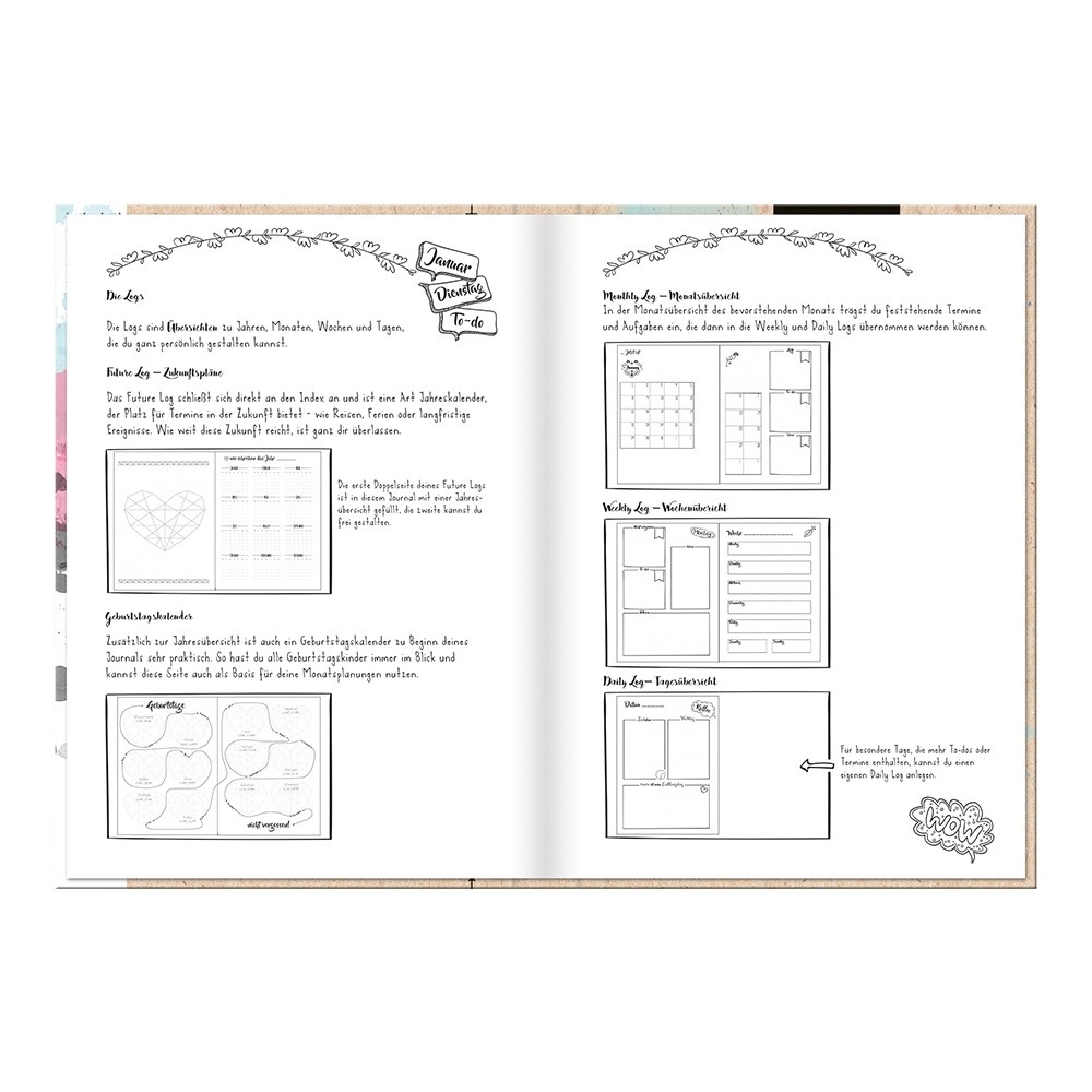 Dabei helfen die Einteilungen in Jahresübersicht, Monatsübersichten, Wochenübersichten und Seiten für To-dos und Ideensammlungen.
