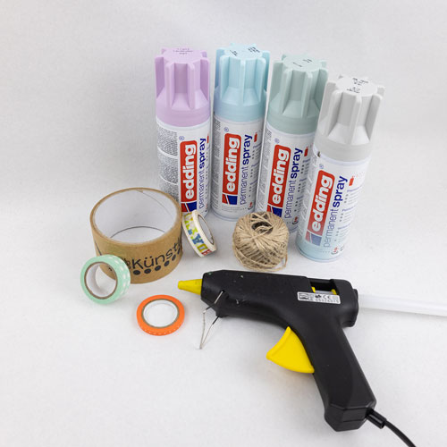Wenn du Lust hast, kannst du dein Werk noch nach deinen Vorstellungen verzieren: z. Bsp. mit verschiedenen Verpackungsbänder oder auch Permanent Marker oder Porzellanstifte können hier zum Einsatz kommen.