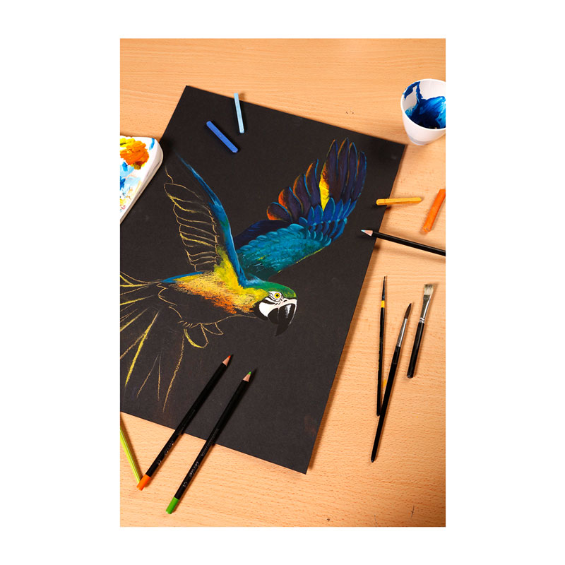 Dieses 250g schwere Papier aus 100% Zellulose ist einfach unverzichtbar, da es vielseitig einsetzbar ist und ein gutes Preis-Leistungs-Verhältnis bietet. PaintON wurde speziell entwickelt, um Künstlern ein Papier zu bieten, das den unterschiedlichsten Qualitätsansprüchen gerecht wird und sowohl für Trockentechniken, als auch für Nasstechniken, wie Gouache oder Acryl, verwendet werden kann. Schwarzes Papier mit einer leicht rauen Oberfläche. In der Masse gefärbt. Mit einem ausgezeichneten Absorptionsvermögen. Das tiefe Schwarz ermöglicht kontrastreiche Arbeiten. Auf dem Papier können wiederholte Korrekturen vorgenommen werden, es ist widerstandsfähig gegen Radieren, Kratzen und Schaben.