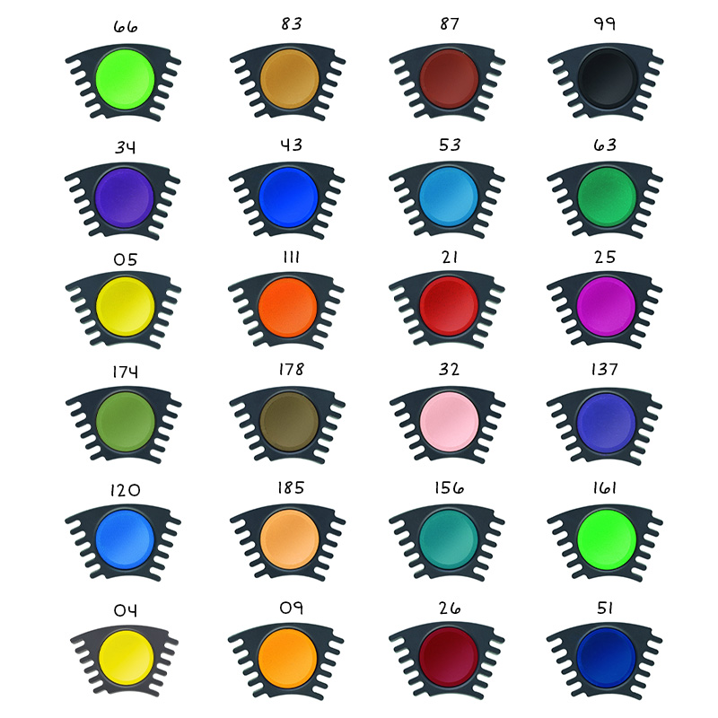 Die Faber-Castell Connector Farbnäpfchen sind in 24 verschiedenen Farben erhältlich und können individuell zusammengesteckt werden. Die Näpfchen unterstützen so das Erlernen der Farbenlehre. Die Farbnäpfchen passen in den Connector Farbkasten und bieten in Kombination mit dem faltbaren Clic&Go Wasserbecher viele Möglichkeiten zum Malen, Basteln und Spielen.