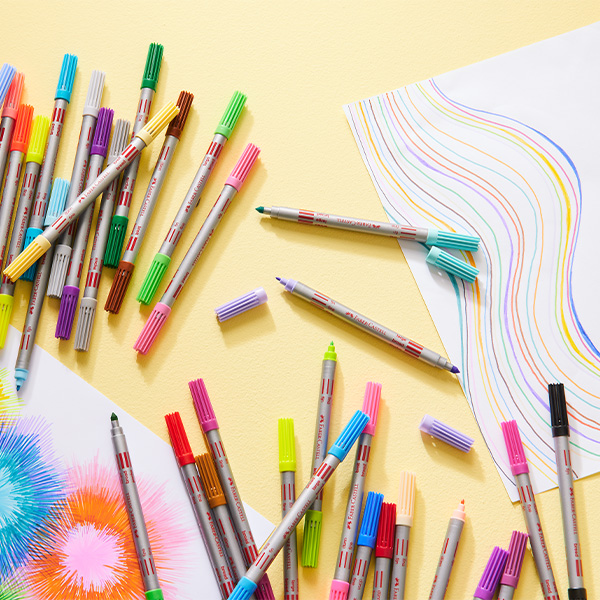 Das Faber-Castell Doppelfasermaler Set enthält 10 Filzstifte mit je zwei Spitzen. Die breite Faserspitze ist für große Farbflächen geeignet, während man mit der dünnen Spitze feine Linien zeichnen und Details akzentuieren kann. Die unterschiedlichen Strichbreiten sorgen für Kreativität durch grenzenlose Maltechnikmöglichkeiten. Die Strichstärke beträgt ca. 3-5 mm.
