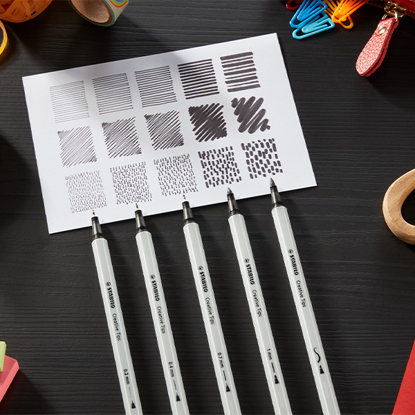 Die Multi-Liner STABILO Creative Tips sind durch die verschiedenen Strichstärken und Stiftspitzen vielfältig kreativ einsetzbar. Ob ein aufwändiges monochromatisches Kunstwerk oder bunte Letterings, die Stifte sind die perfekten Werkzeuge für Gestaltungen aller Art. Sie umfassen einen extrafeinen Fineliner mit 0,2 mm Spitze sowie zwei Fineliner mit gefederten Spitzen in 0,4 mm und 0,7 mm Strichstärke, einen robusten Filzstift mit 1 mm Strichstärke und einen Filzstift mit flexibler Pinselspitze (Brush). Die Premium-Auswahl ist in verschiedenen Sets mit verschiedenen Farbkombinationen erhältlich. Die Tinte aller Stifte ist wasserbasiert und aquarellierbar. So sind atemberaubende Effekte und Farbverläufe umsetzbar.