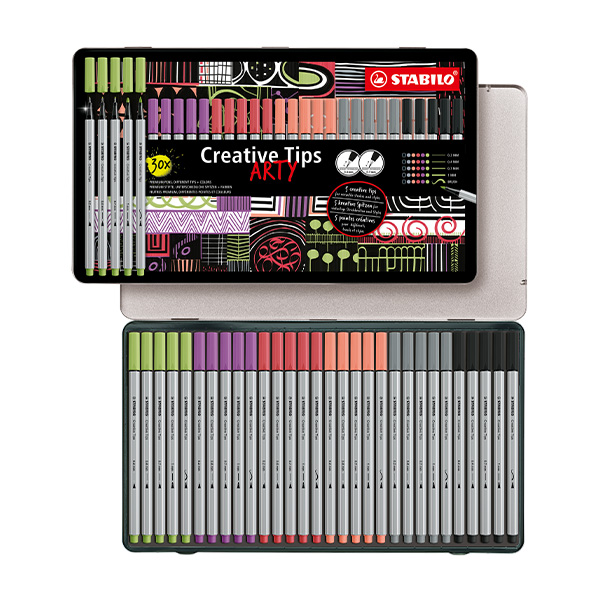 Das Creative Tips Arty 30er Metalletui (Pastell Farben) von Stabilo enthält Premium Stifte in unterschiedlichen Spitzen und Farben.