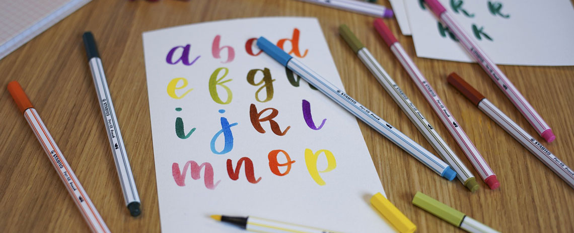Mit Brush Pens kann durch Variation des Drucks die Dicke des Strichs beim Schreiben verändert werden. So entsteht die charakteristische Brushlettering Schrift.