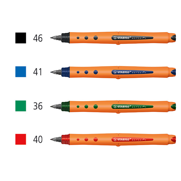 Der Stabilo Tintenroller worker+ Fine (0,3mm) ist in den folgenden vier Farben erhältlich: 46 Schwarz, 41 Dunkelblau, 36 Grün, 40 Rot