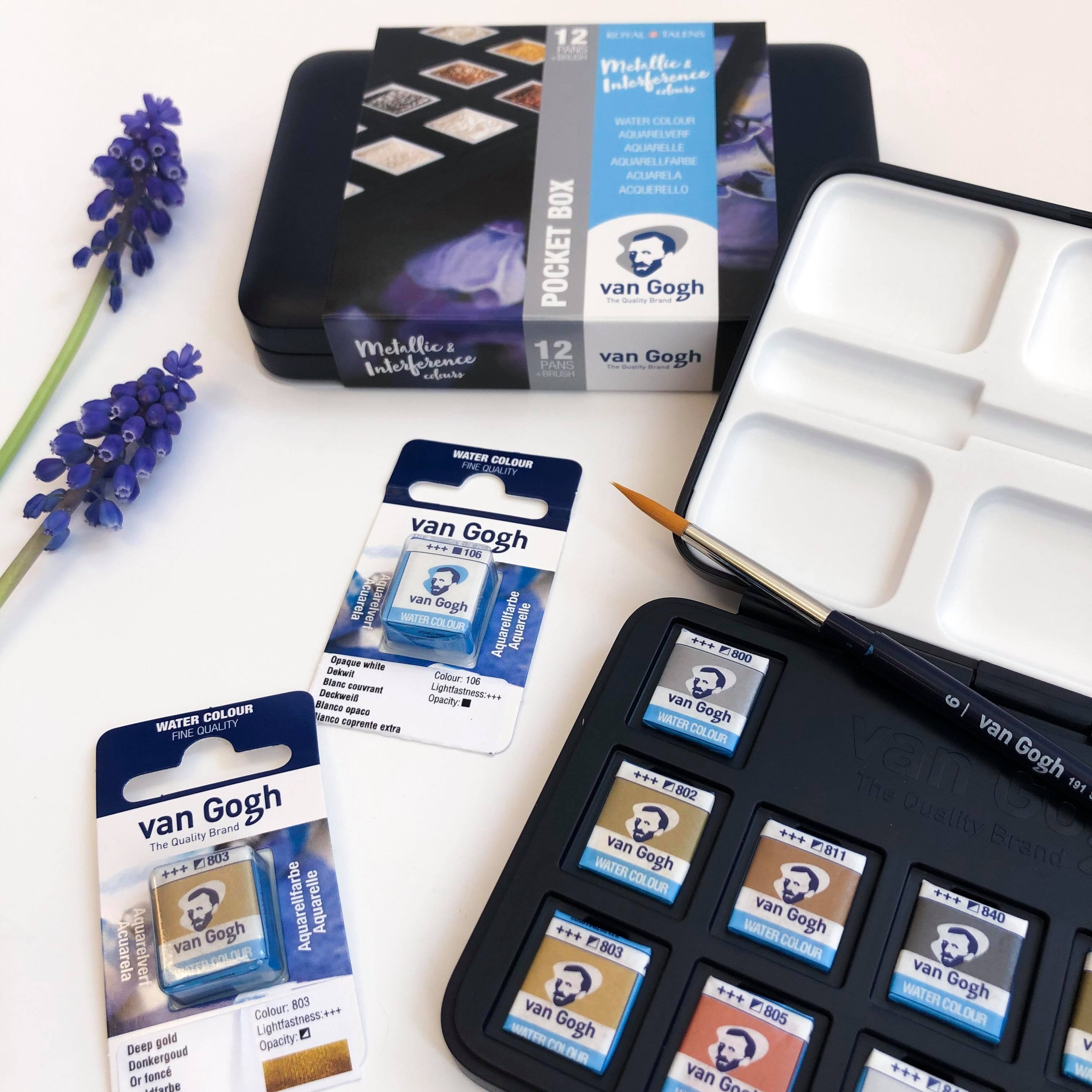 Die Aquarellbox von Royal Talens ist mit 12 halben Näpfen in Metallic & Interference-Tönen aus der VAN GOGH Serie bestückt. Die kräftigen, reinen Farben sind eine ideale Wahl für Einsteiger & Hobbymaler. Farbübergänge und Mischtechniken lassen sich durch die gleichbleibende Viskosität leicht erzeugen. Selbst wenn die Farbe stark verdünnt wird, bleiben die höchste Lichtechtheit und Leuchtkraft bestehen. Van Gogh Aquarellfarben sind umweltschonend und von keinen Schwermetallen belastet. Die praktische Pocketbox für die Aquarellmalerei ist mit einem Pinsel (191/6), einer Mischpalette und folgenden Farben ausgestattet: 800, 802, 803, 811, 805, 840, 843, 844, 845, 846, 847, 848.